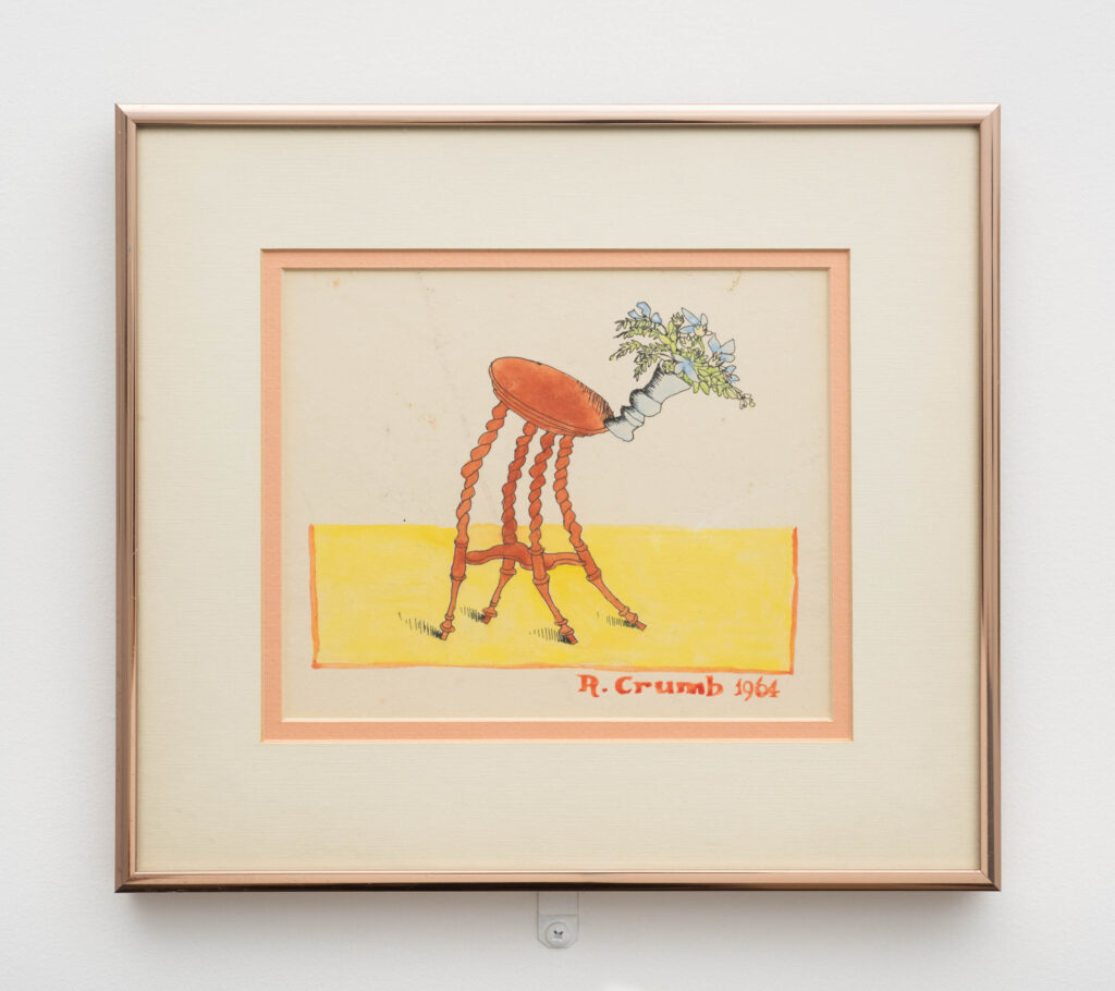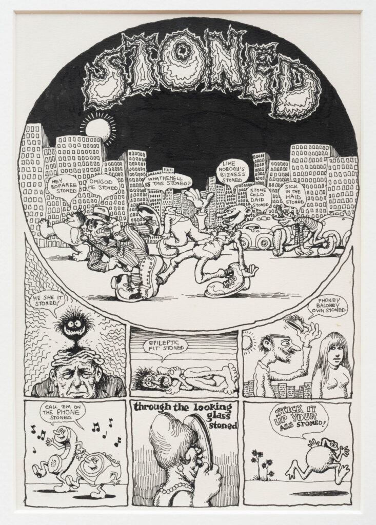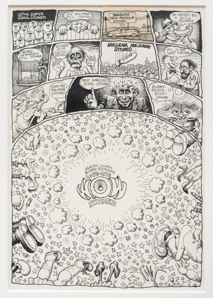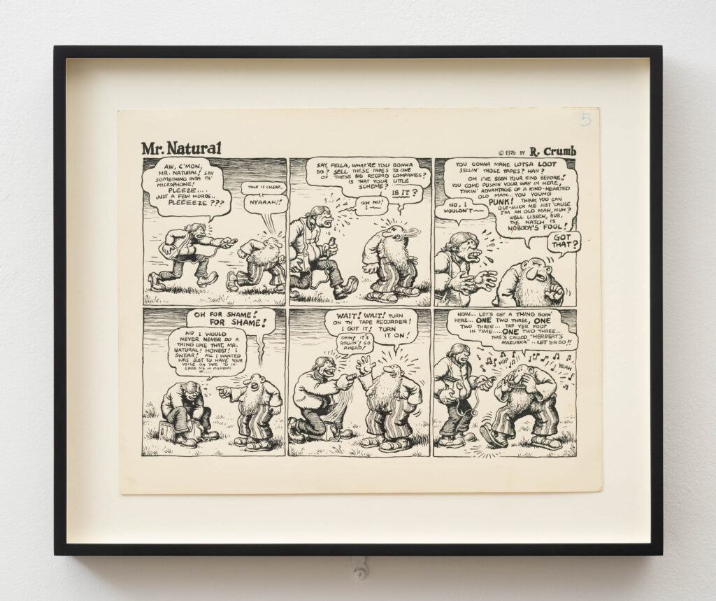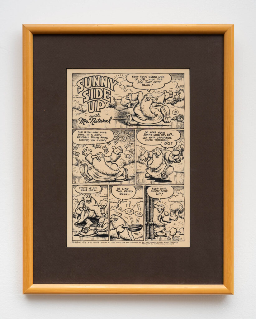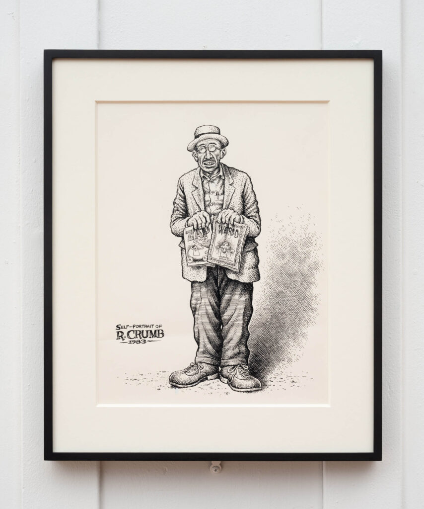 Nadel reports that one of the pleasant surprises of his research was encountering Crumb’s generous friends. Primarily through bartering, many of them came to live with artworks, including drawings from the very first Zap Comix, iconic Mr. Natural pages, portraits of lovers, friends, and admired musicians, political cartoons, object studies, and the self-portrait that became the biography’s cover. Cushion Works is pleased to present these works, most of which have never before been exhibited.