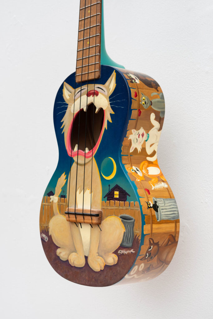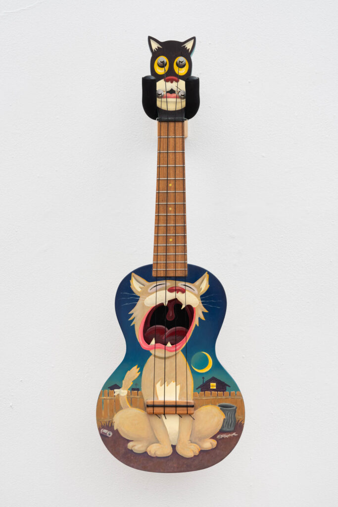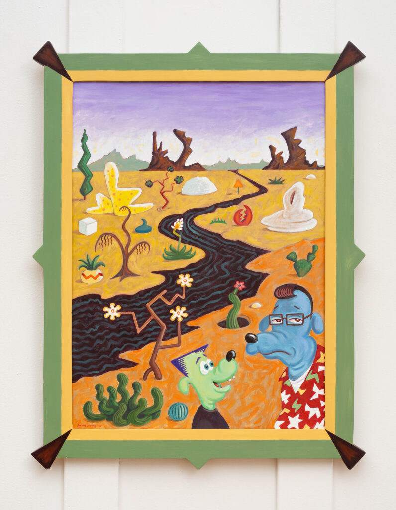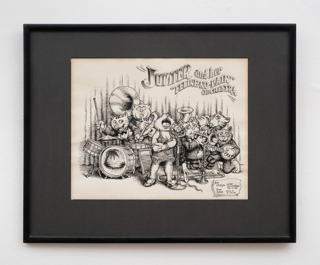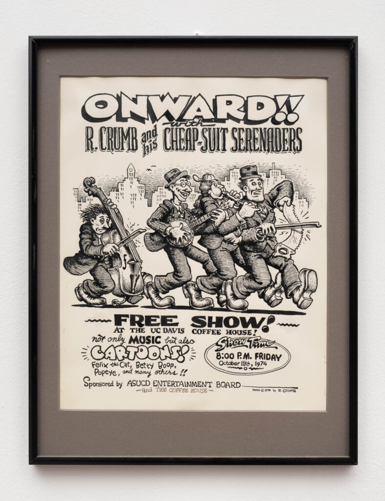 While Crumb cuts a singular figure, the lives of artists are never truly singular: Crumb ran with a network of talented fellow travelers, including the great Robert Armstrong, an artist who invented the dissolute Mickey Rat character in 1971 and later trademarked and popularized the term “Couch Potato.” Armstrong also produced extraordinary paintings replete with joyous visions of musicianship, animal life, and visions of the future informed by his knowledge of Hawaiian music, Disney cartoons, and mid-century signage.