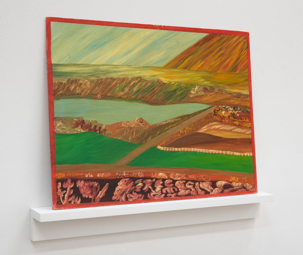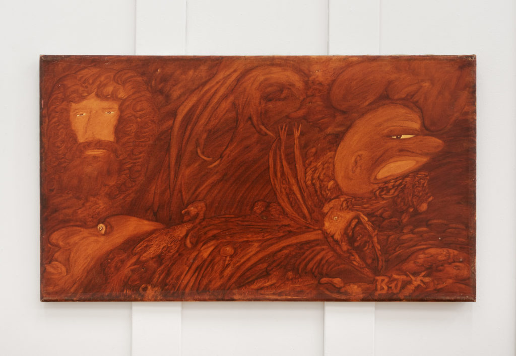 We are fortunate to live with these paintings even for this short time. How they arrived at this place, right now, is a bit of a story: Cushion Works proprietor Jordan Stein is five years younger than I am, but born and raised of the same striving Jewish stock in the suburbs ringing Washington D.C. He attended, as I did, a high school so liberal that my English teacher wept the day Charles Bukowski died. Jordan and I met a few years back in San Francisco, a city that only Cushion Works could make feel intimate and vastly mysterious. One day Jordan was visiting my home in Carroll Gardens, Brooklyn, when he spotted something above the staircase: In all the years I’ve lived with my B.J. Newton painting, Jordan was the first human to actually recognize it. Like me, he had once visited the extraordinary domain of two eminent Chicago artists, and like me he’d been distracted by the mudlark, blood-red images on masonite. What is this?, we both asked. This is B.J. Newton, they said. In fact, long ago, while acting as art agents for Joseph Yoakum and a passel of Martin Ramirez objects, they’d attempted much the same with Newton to less spectacular results.