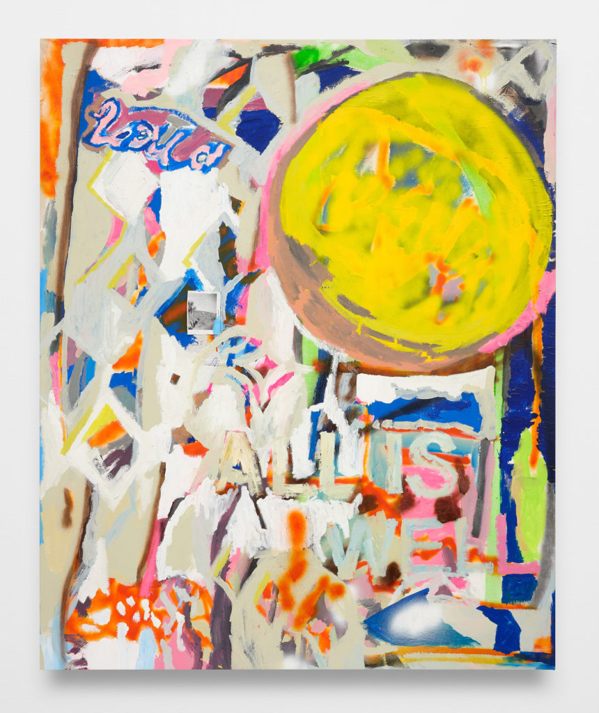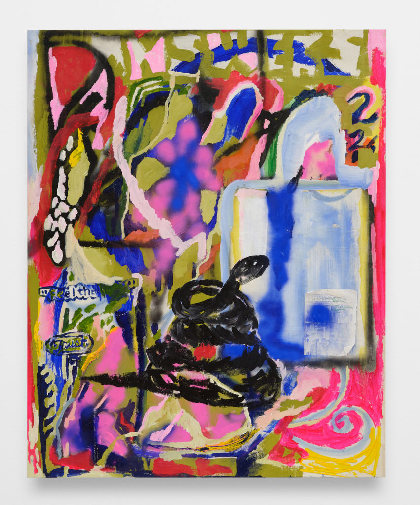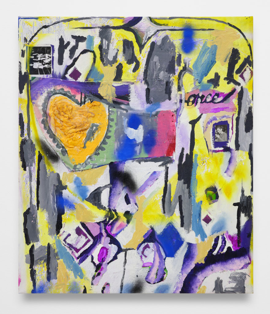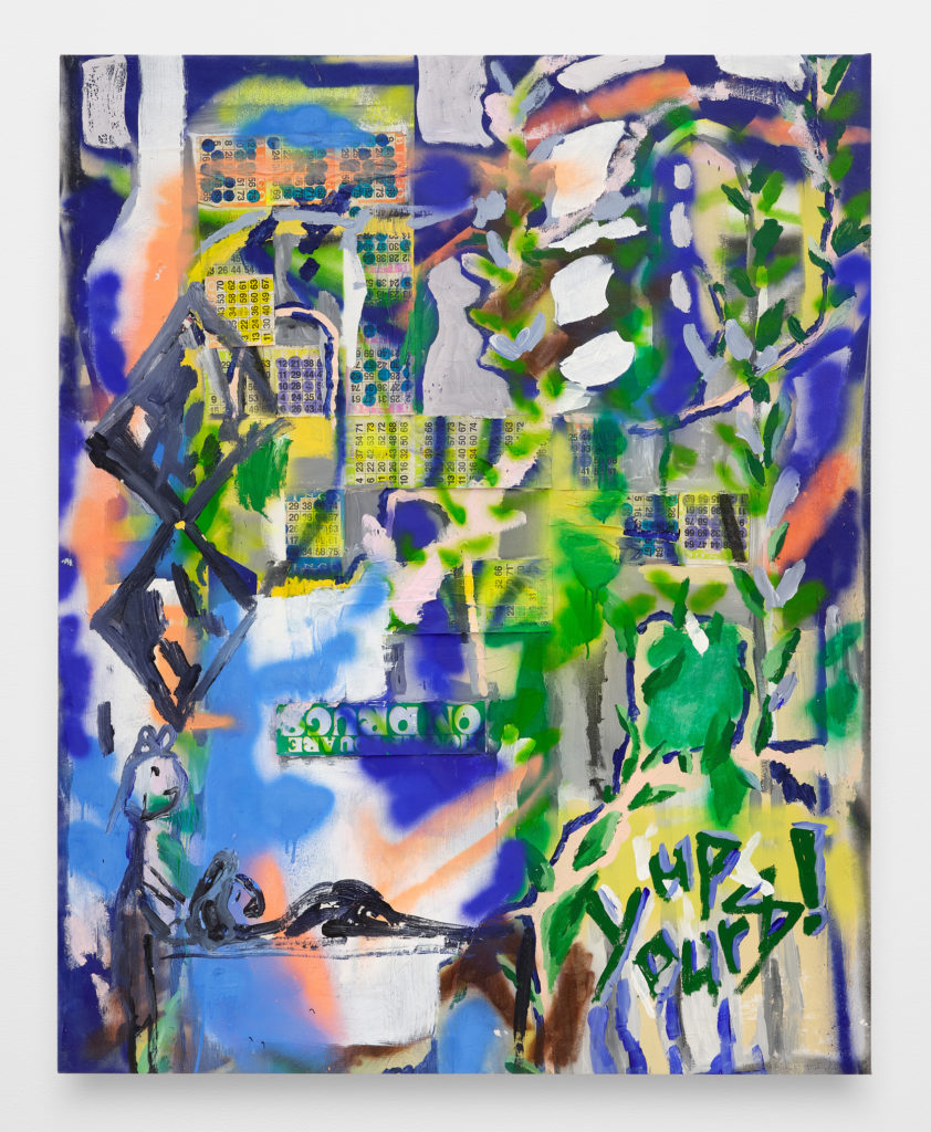 Perkins’ iconography is informed by sources as varied as bad graffiti, the NBA, and local antique malls in downtown Albuquerque, where she lives and works. She has recently incorporated family photographs, bingo cards, bumper stickers, cut remnants of past paintings, and more, forming a collage of signifiers. The works are not private, but intimate, suggesting that closeness is not only a series of codes, but its own code, both personal, familial, and complex.
