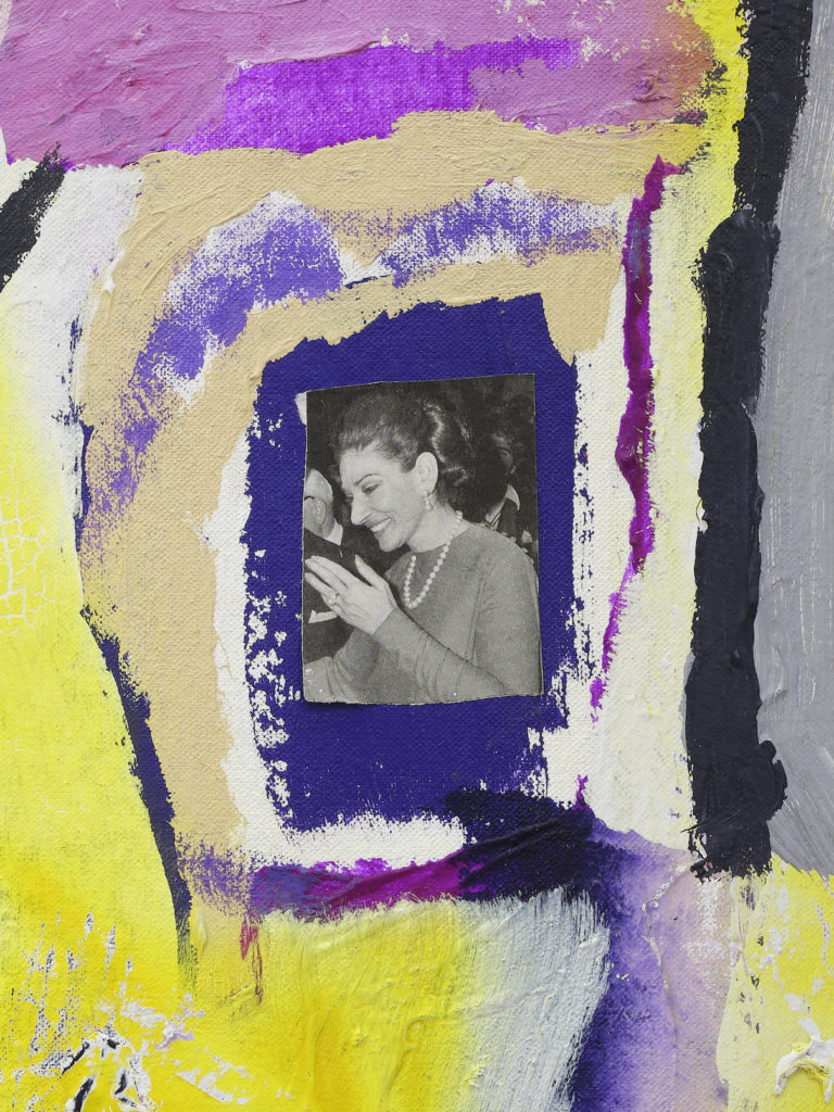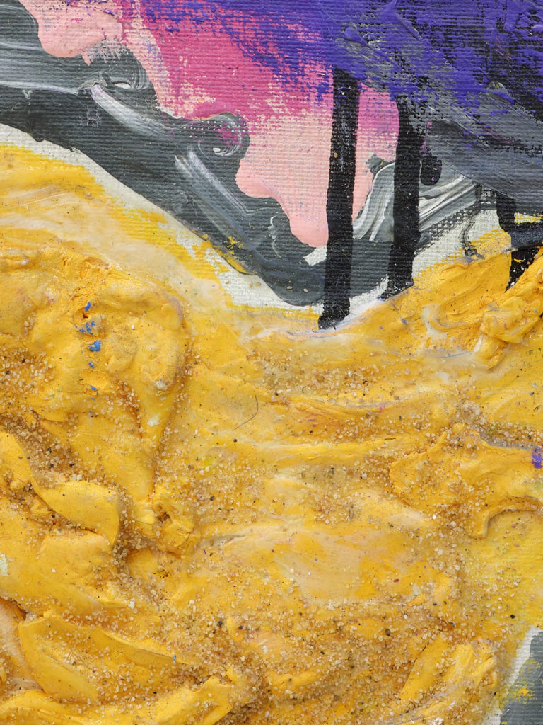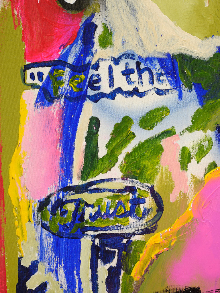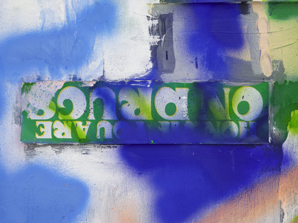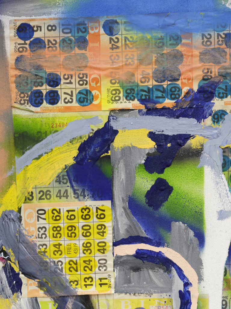 Acrylic, spray paint, ink, bingo cards, bumper sticker
