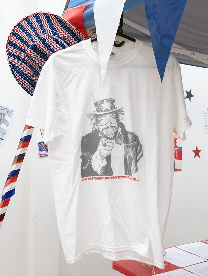 Frank Moore (1946–2013) was an artist, poet, painter, shaman, and teacher based in Berkeley, California. In 2008, and alongside running mate Susan Block, a sex educator and author, he mounted a campaign for president of the United States of America. A political novice who used a wheelchair and communicated primarily through a head-pointer, Moore intrinsically challenged norms of appearance, ability, and communication simply by way of showing up.