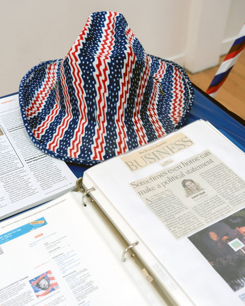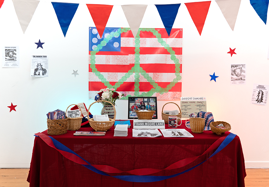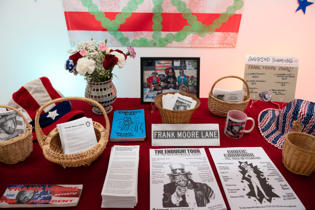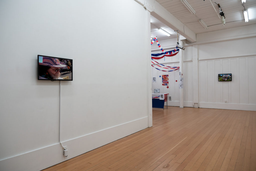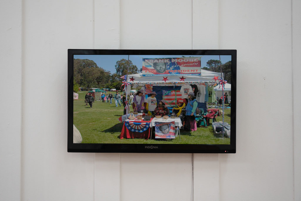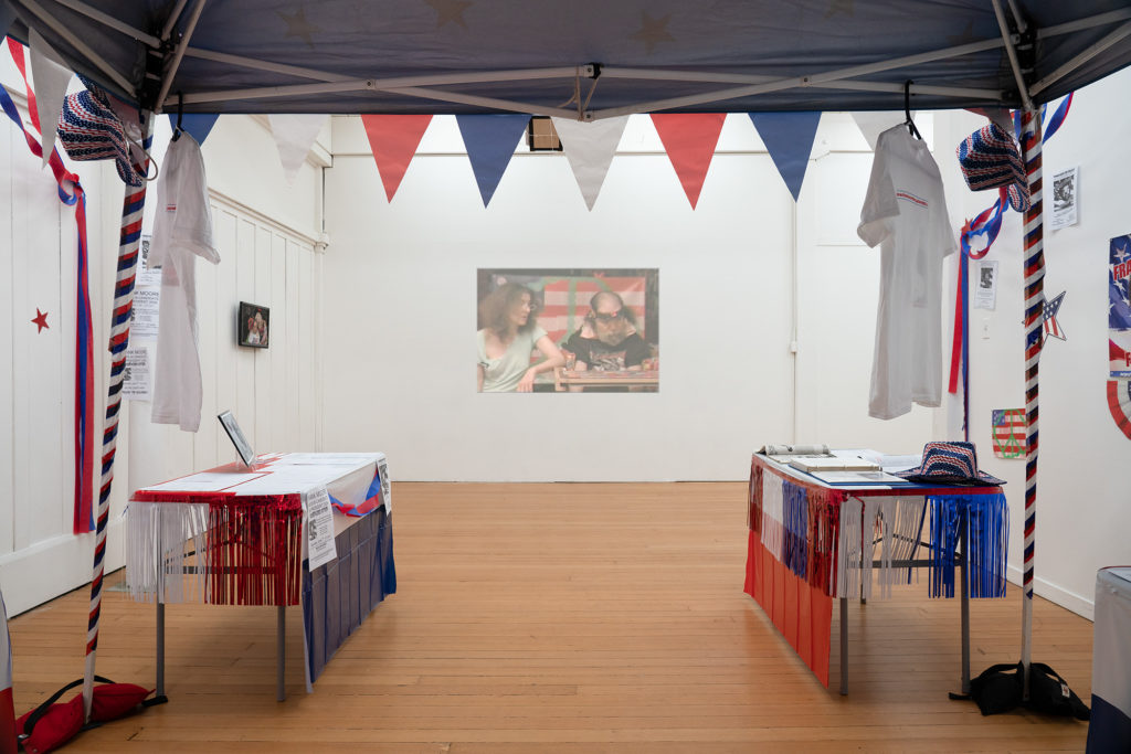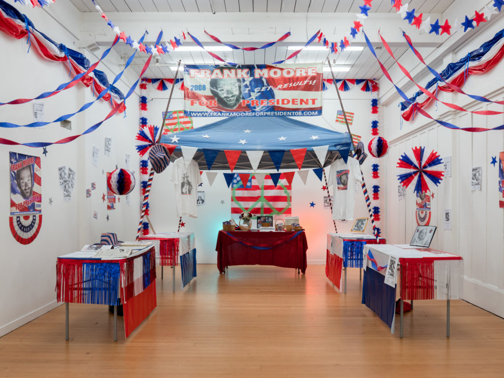 I Get Results! presents archival video footage, including public appearances and platform pronouncements, alongside official campaign documentation, press, and merchandise, all set within a patriotic installation modeled after the Moore/Block info-table assembled for events around the Bay. The exhibition opens on Inauguration Day, 2021, and remains on view for six weeks.