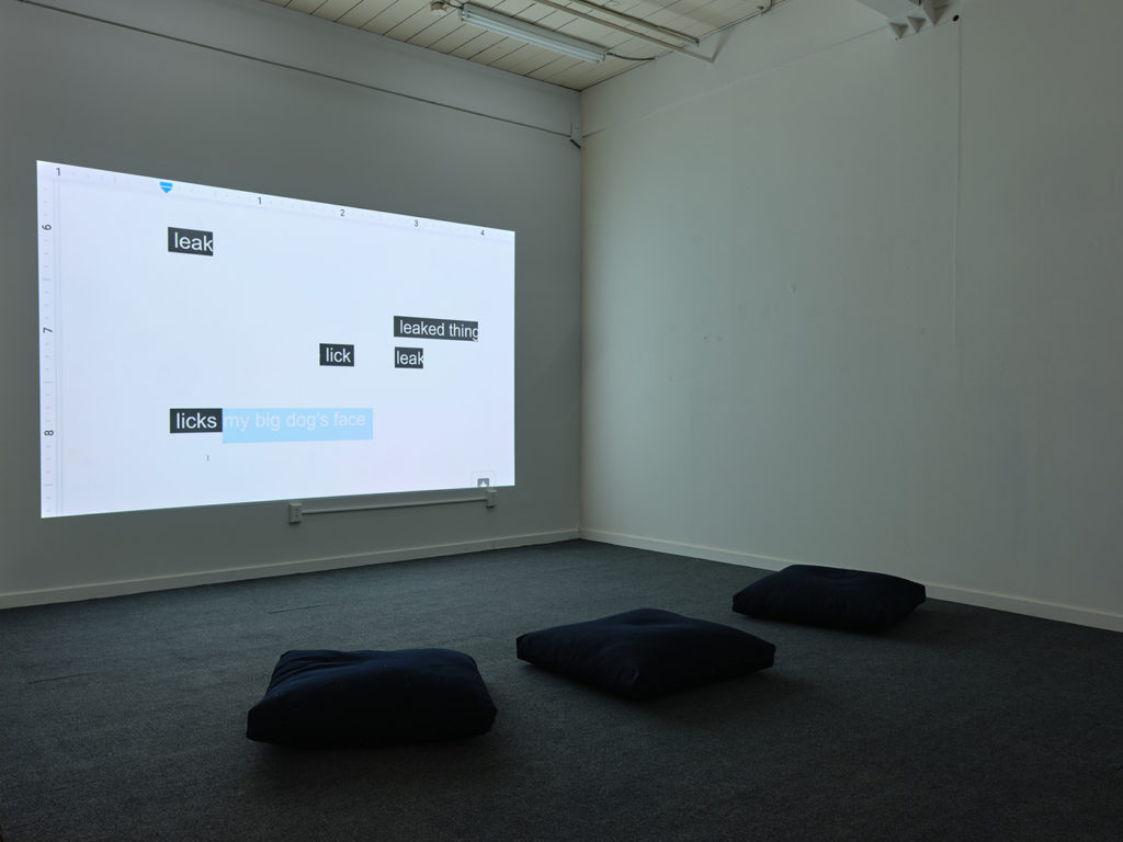 Roasted Cockroach for Scale still. Digital video with color and sound, 47 minutes, 2022. [Video still of a tightly zoomed and cropped transcription. The text reads “country, I I feel a void.” “void” is highlighted.]