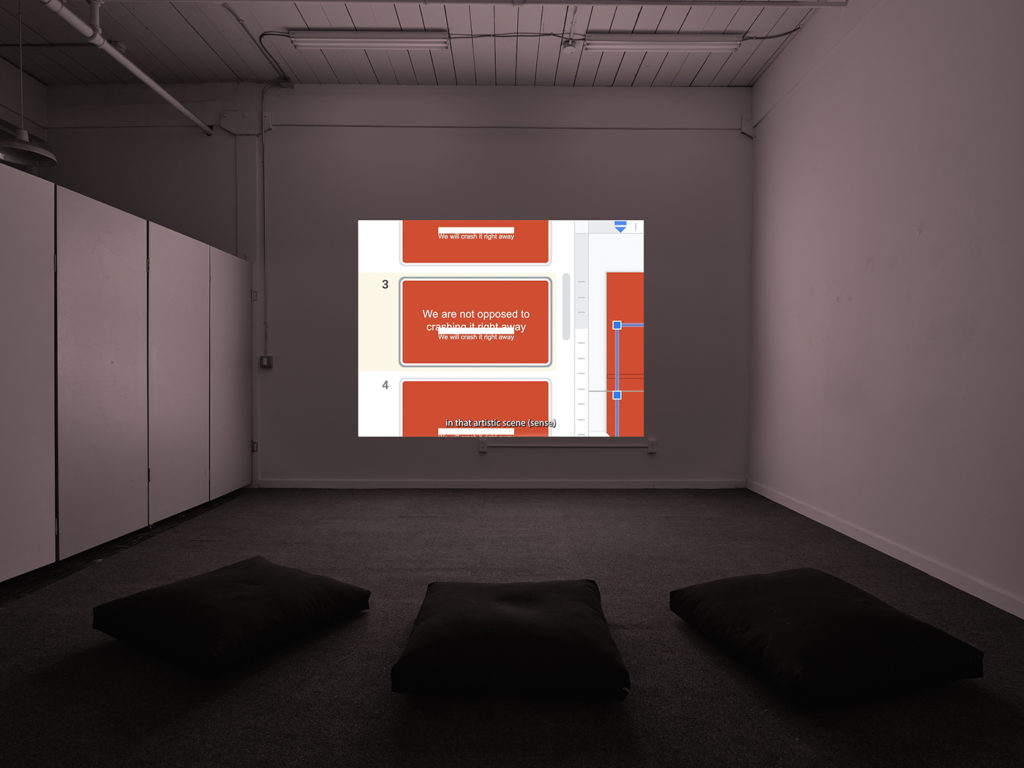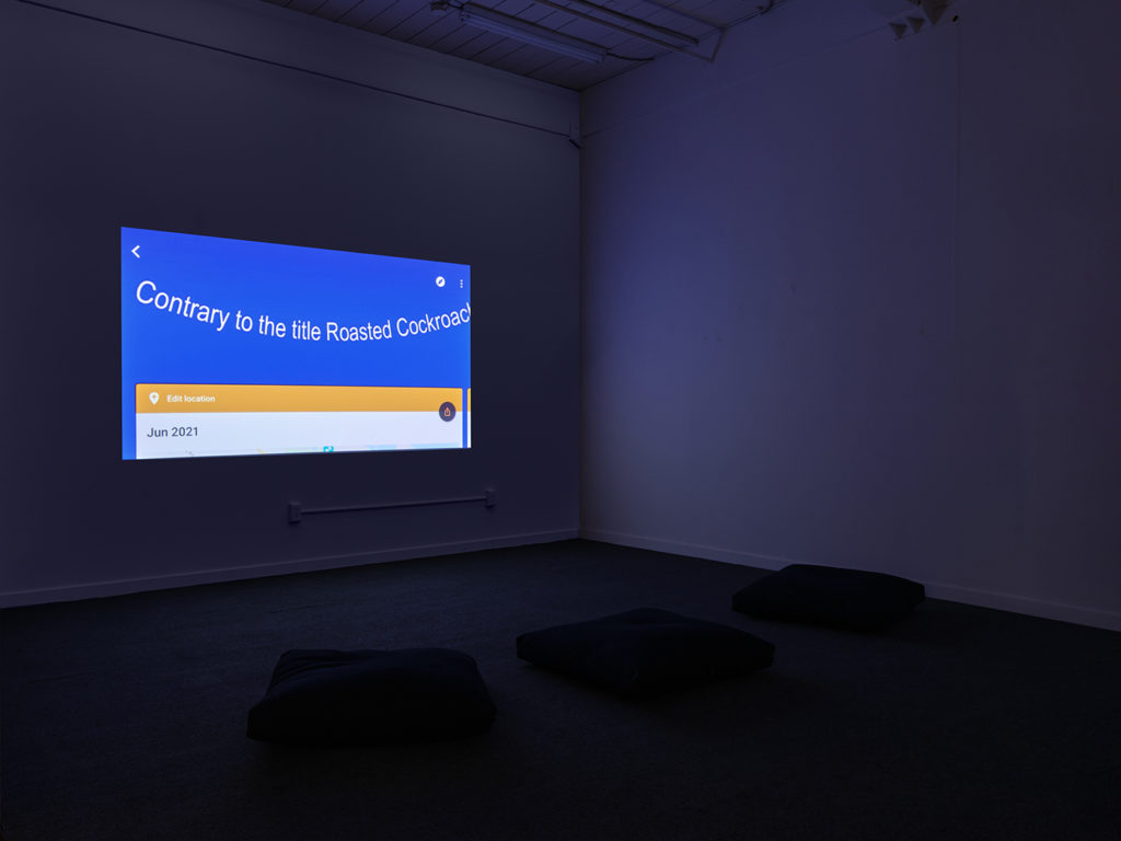 Made in collaboration with the artist’s Soviet-Israeli-American father, Roasted Cockroach for Scale is a fragmentary portrait of a transnational and transgenerational relationship. Calibrated to the specific qualities of remote communication in the global viral pandemic, the film consists entirely of text-based screen recordings created using Google, Zoom, and AI-speech-to-text software. Playful and tender interactions between the filmmaker and their father activate a web of narrative, formal, and political connections between disability and diaspora in this improbable film, which orbits themes of illness, memory, genocide, displacement, militarism, statehood, and ableism. [laughter]