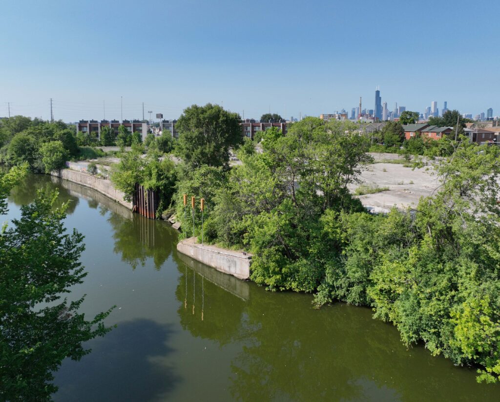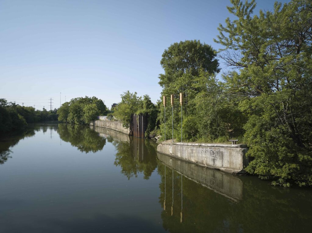Three bat houses constructed and installed along Bubbly Creek by artist Nick Raffel aim to provide shelter for bats to roost and raise their young. The dual chamber units are designed by the Human-Wildlife Interactions Lab at the University of Illinois and widely used in conservation efforts. Bats dwell shoulder to shoulder inside; their thermal energy heats the space.